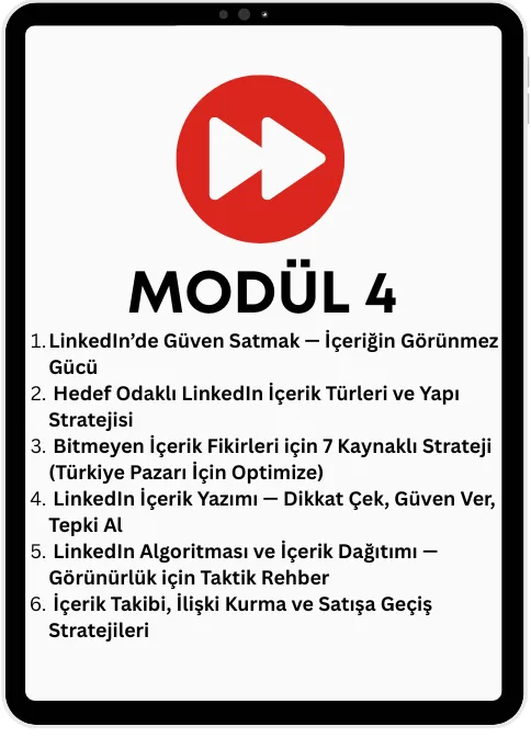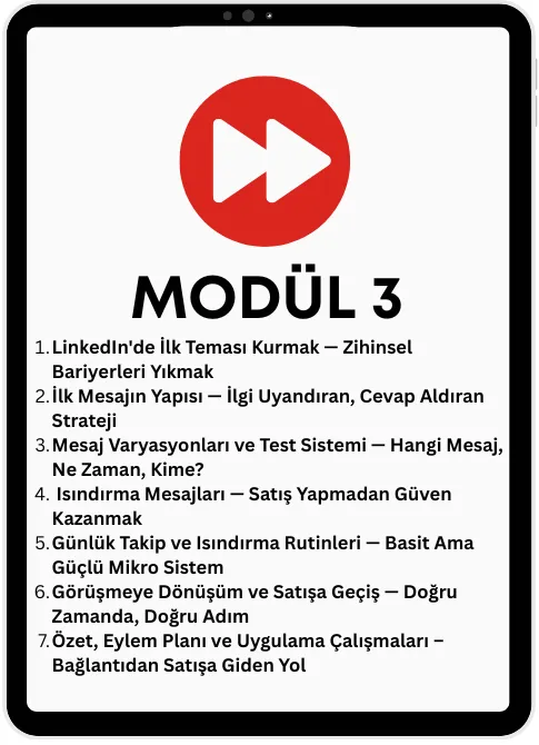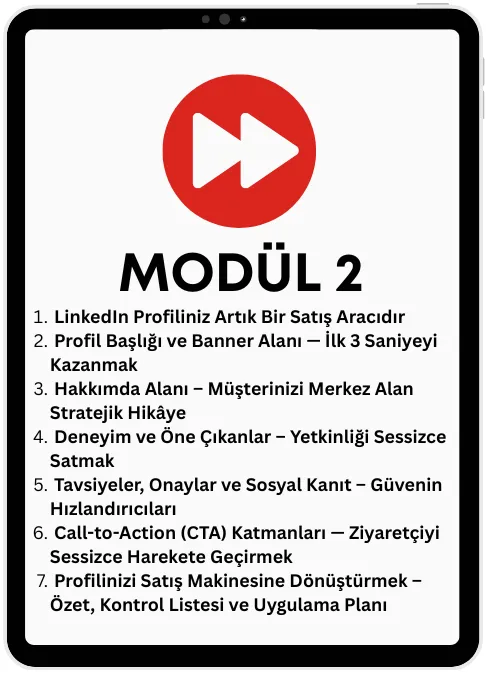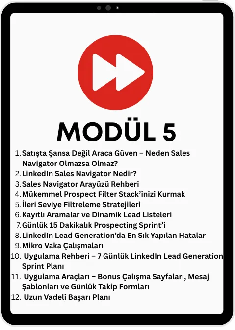 12 Bölümden Oluşan Bu Modülde Sales Navigator Kullanımında Uzmanlaşarak, Sales Navigator Arayüzü Rehberi, İleri Seviye Filtreleme Stratejileri, Uygulama Rehberi, Bonus Çalışma Sayfaları, Günlük Takip Formları Gibi Başlıkları Öğreneceksiniz